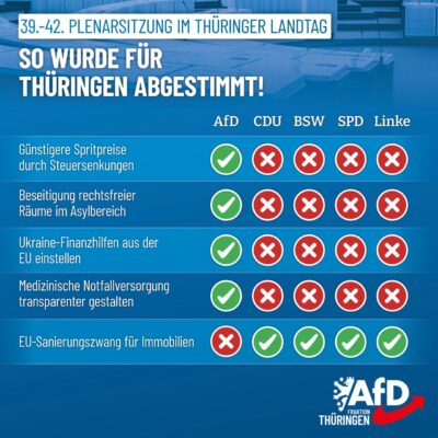 Seit der letzten Landtagswahl sind wir die stärkste Fraktion im Thüringer Landtag und damit das einzige Gegengewicht zur eilends geschmiedeten »Brombeer-Koalition«. Vertrauen Sie auf uns als starke bürgerliche Kraft in Thüringen!